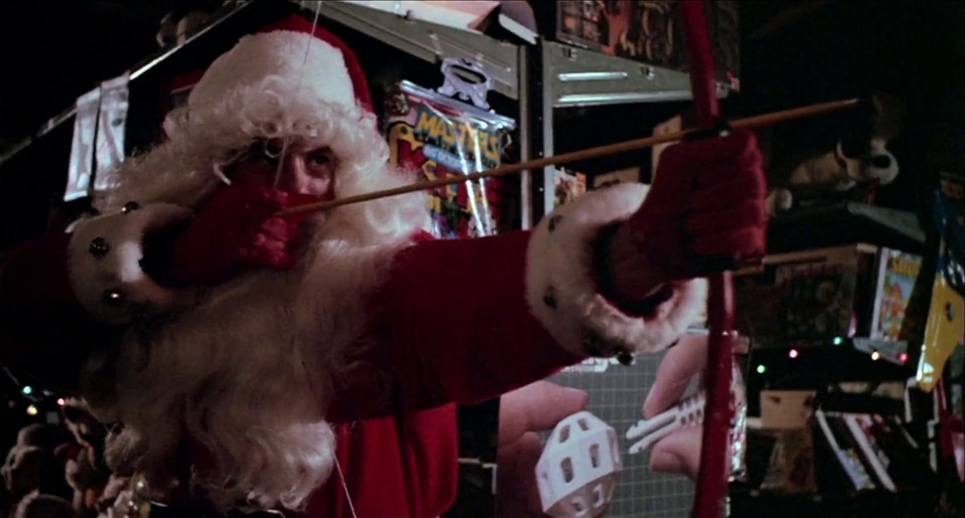 Okay, cancel your bets and shelve your arguments, because this is officially the greatest Christmas movie ever made. Notorious for its long career of being protested, reviled, censored and blackballed, this picture hardly deserved the denigration. So what if it portrays a murderous Santa who shoots dad and cuts mom’s throat after ripping her blouse open on the side of the road, in full view of one of her kids, after having already killed a store clerk, and why get all hot and bothered that one of those orphaned kids who witnessed the highway carnage grows up to be so traumatized by the very idea of old Saint Nick that he embarks on a Christmas Eve killing spree highlighted by impaling a topless Linnea Quigley on a stag’s head in her living room before gifting her little sister a boxcutter and leaving her with the mess? Man, people are sensitive sometimes. Ironically enough, the parental complaints lodged against the film upon its original release were that their little moppets would be traumatized by such a depiction of K. Kringle … which is, not to put too fine a point on it, exactly what the movie depicts.