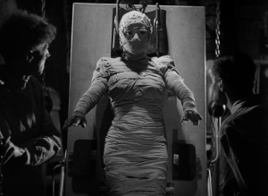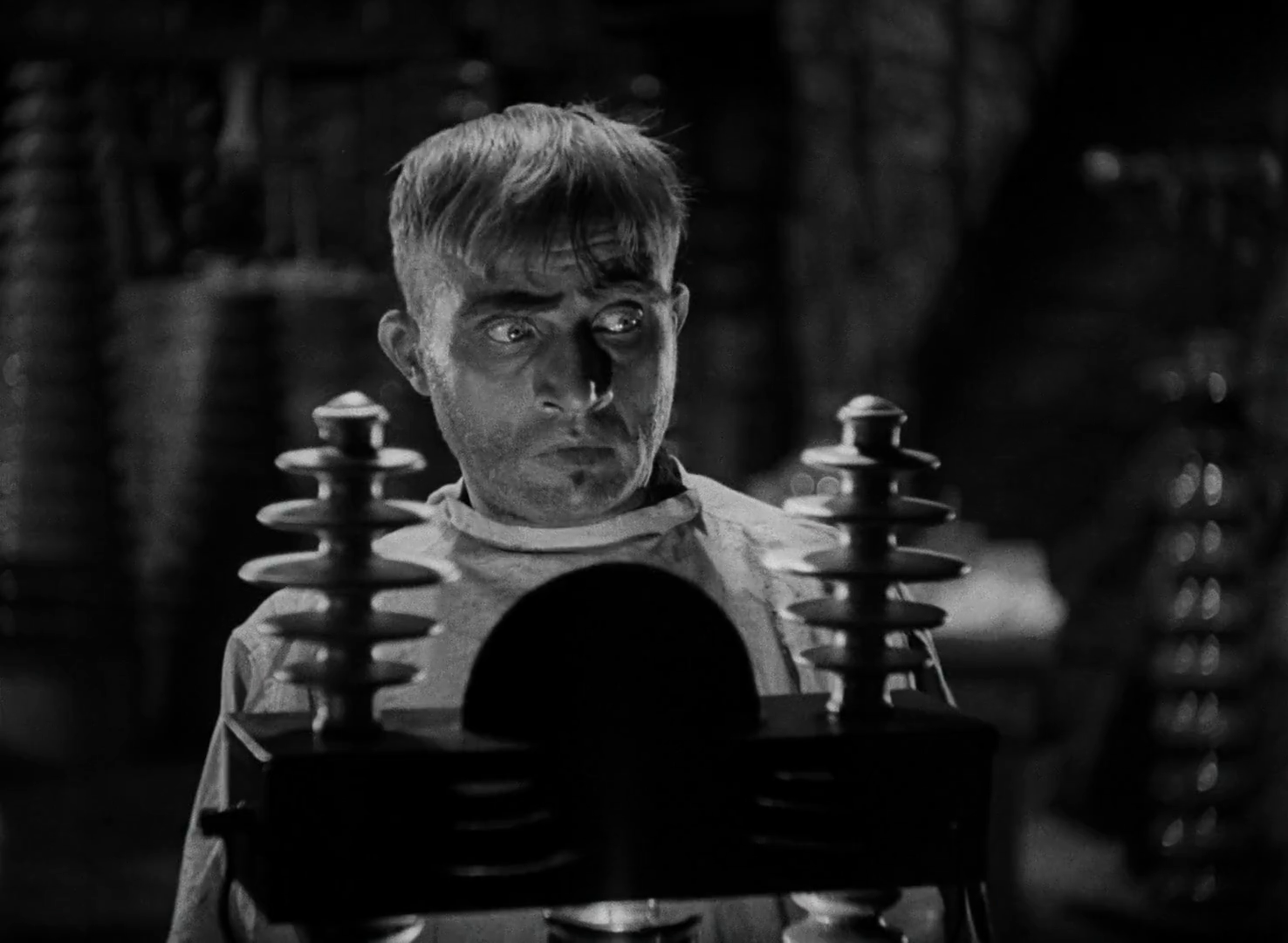 The sequence during which the MONSTER busts out of the dungeon in which he’s been confined, evades the hunt, and tumbles into the crypts from which Pretorius and his henchmen are commandeering corpse parts is pretty memorable. Once again, the studio-lot sets are awe-inspiring, at least the interiors. (The outdoor scenes, not so much.) I could have done without the “humorous” touches and their focus on the lowbrow.